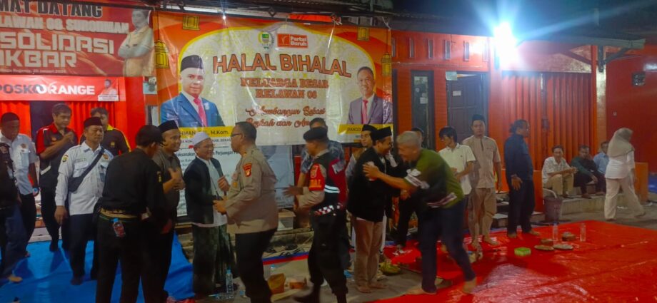 Kapolsek Serang Baru AKP Hotma P Sitompul bersama jajaran menghadiri acara Halal Bihalal di kediaman Anggota DPRD Kabupaten Bekasi Fraksi Partai Buruh Surohman SH MKom, Sabtu (18/4/2026) malam. Kegiatan berlangsung di Perum Mega Regency Blok D Gor RW 15 Desa Sukaragam, Kecamatan Serang Baru.
