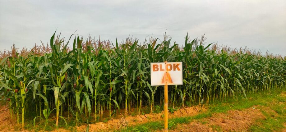 Tanaman jagung di Blok A sudah tumbuh subur dan keluar bunga, sementara di Blok B, tanaman jagung sudah keluar bunga dan putren sekitar 70% dengan usia tanam 65 hari.
