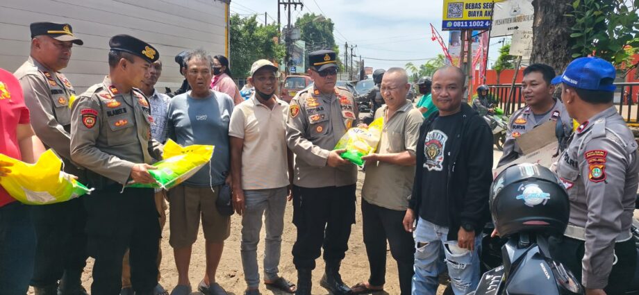 Dalam kegiatan ini, Polsek Serang Baru membagikan beras sebanyak 5 kg kepada setiap ojol yang melintas di lokasi kegiatan.